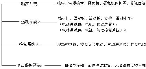 電動及氣動進(jìn)退膛電視監(jiān)視裝置,在冷卻風(fēng)出現(xiàn)斷風(fēng)故障時,能自動將潛望鏡管退出爐膛,以免燒壞輸象系統(tǒng),操作人員也可在控制室內(nèi)通過控制盤上的操作按鈕或電腦控制潛望鏡管的進(jìn)退爐膛。